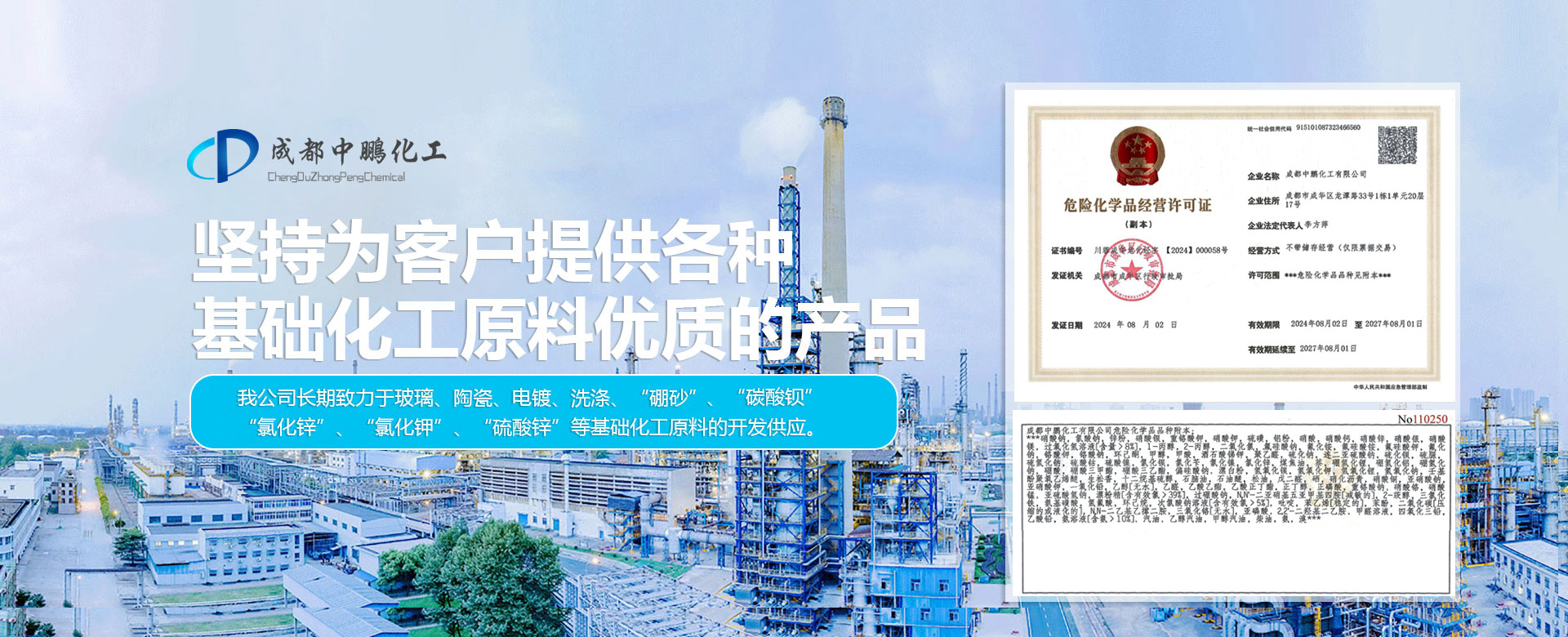 成都中鵬化工有限公司成立于2001年,位于成都市新都區(qū)木蘭木名商塑化城2棟11號,公司成立16年以來,一直堅(jiān)持為客戶提供各種基礎(chǔ)化工原料的產(chǎn)品。我公司長期對于玻璃、陶瓷、電鍍、洗滌、“硼砂”、“碳酸鋇”、“氯化鋅”、“氯化鉀”、“硫酸鋅”等基礎(chǔ)化工原料的開發(fā)供應(yīng)。 公司現(xiàn)在員工上百人,在全國擁有多個營銷體系和完善的售后服務(wù)體系,長期以來,通過為客戶提供各種基礎(chǔ)化工原料的產(chǎn)品,形成了良好的合作關(guān)系...